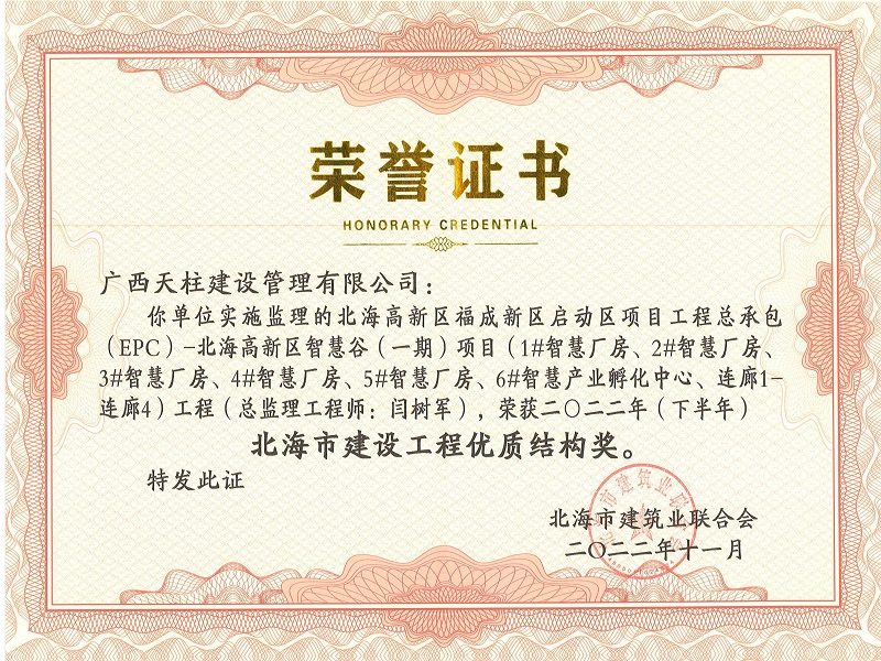 2022年(下半年)北海市建设工程优质结构奖(北海高新区福成新区项目工程总承包(EPC)-北海高新区智慧谷(一期)项目工程)