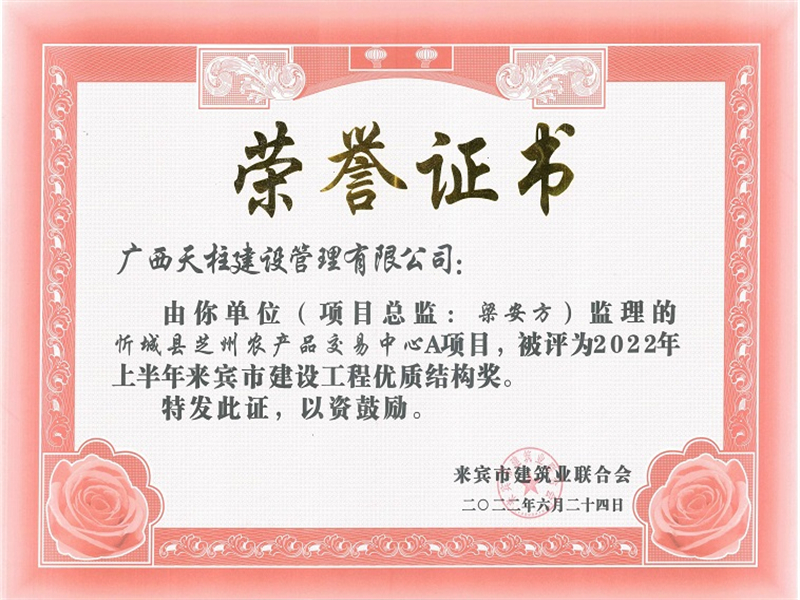 2022年上半年来宾市建设工程优质结构奖(忻城县芝州农产品交易中心A项目)