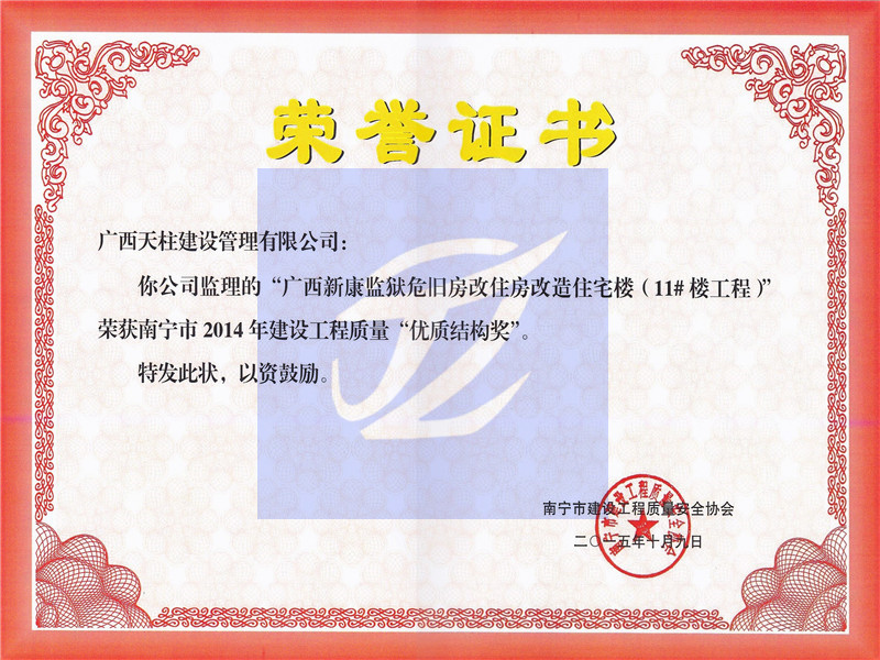 广西新康监狱职工集资楼(11#楼工程)2014年优质结构奖
