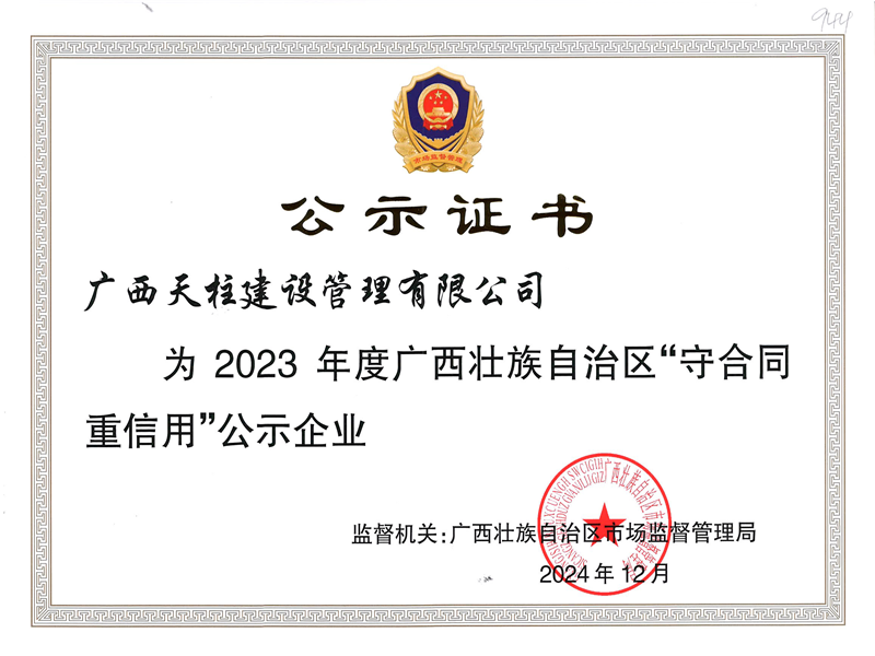 近日,广西天柱建设管理有限公司接连荣获广西壮族自治区市场监督管理局和南宁市市场监督管理局颁发的2023年度“守合同 重信用”公示企业称号。这一双重荣誉的获得,不仅是对公司长期以来坚持诚信经营、严守契约精神的充分肯定,更是对公司综合实力和品牌信誉的高度认可。
