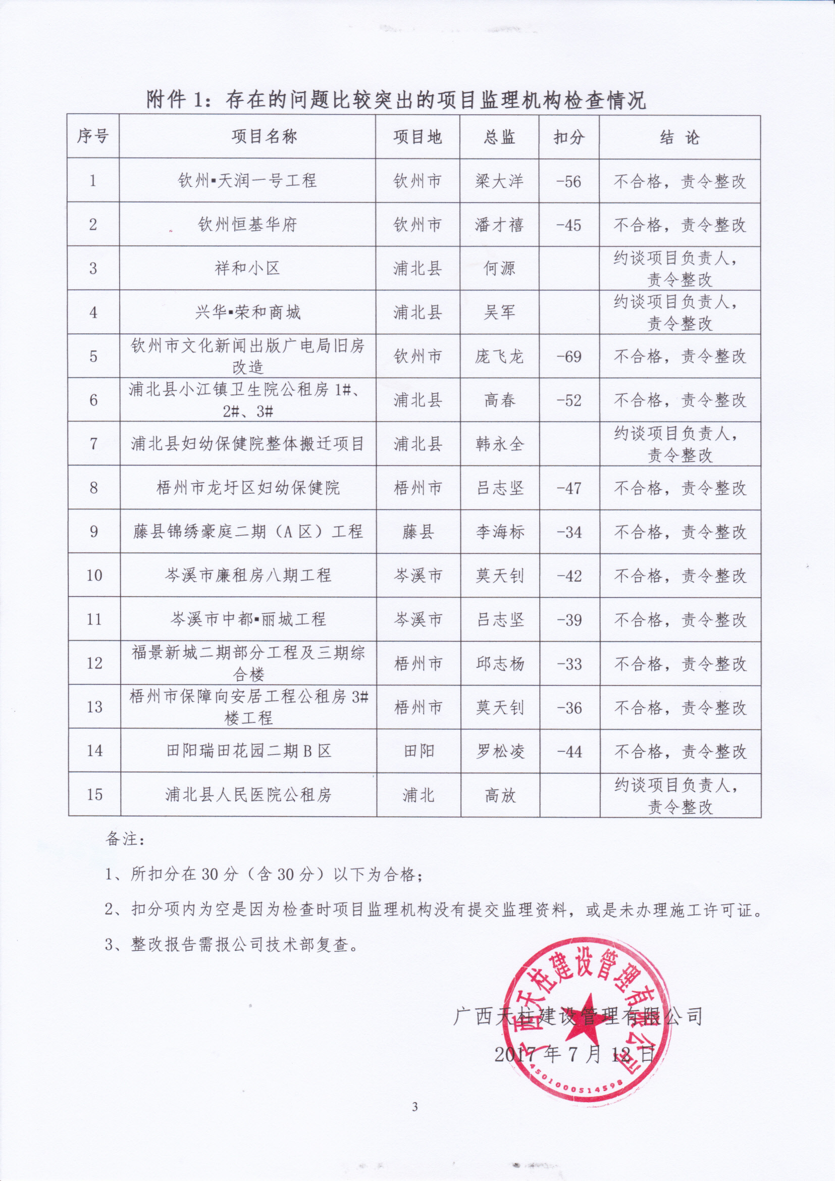 2017年第二季度监理项目工程质量安全检查通报【桂天柱字[2017]18号】