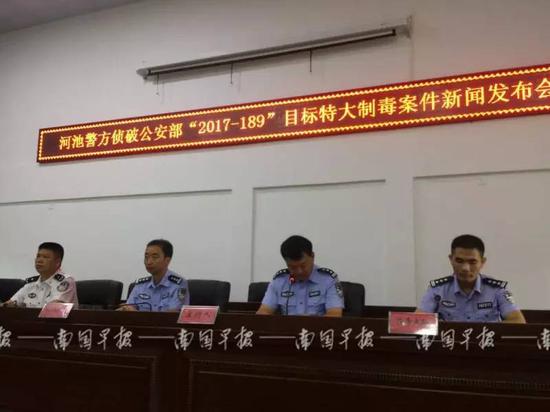 6月15日下午3时,河池警方召开侦破公安部“2017-189”目标特大制毒案件新闻发布会。