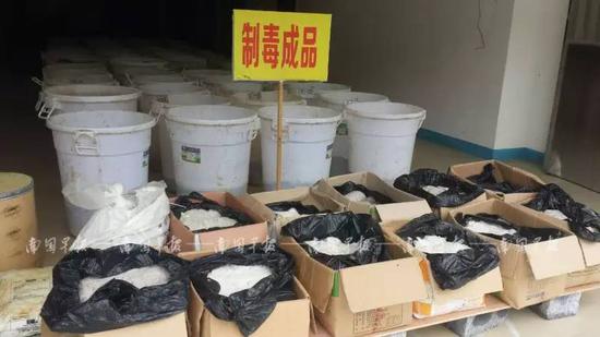 ▲这是缴获的极少一部分原材料、半成品、成品。据了解,这些半成品、成品将运往缅甸制成冰毒,最后再返回中国贩卖。