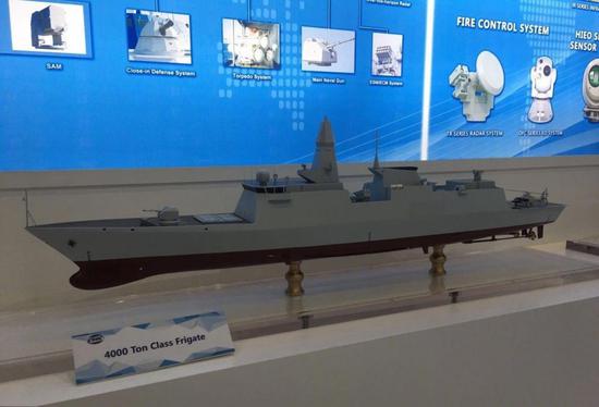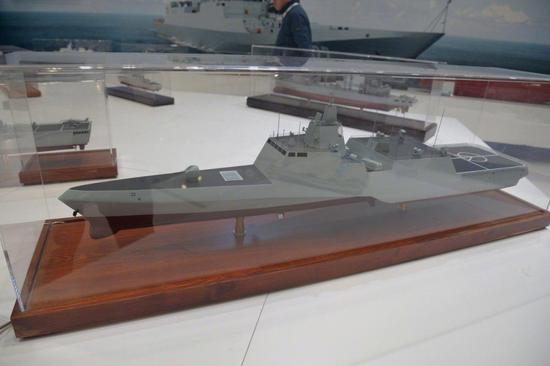 中国船舶企业今年2月在阿布扎比防务展上展出的三体船护卫舰模型。