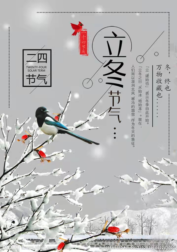 立冬是中华民族24节气之一,古代四立是指春、夏、秋、冬四季开始。立冬这天预示着冬天要开始了,是秋天转变到冬天的转折点。