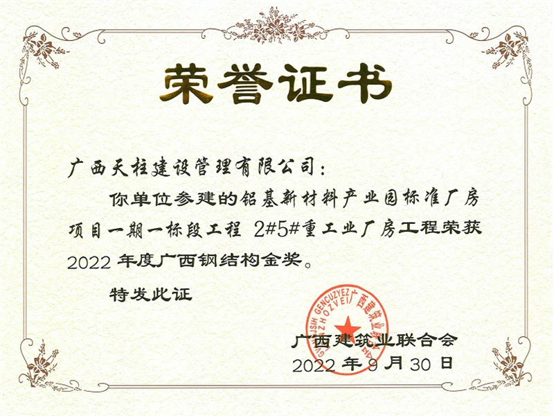 2022年度广西钢结构金奖(铝基新材料产业园标准厂房项目一期一标段工程2#5#重工业厂房工程)