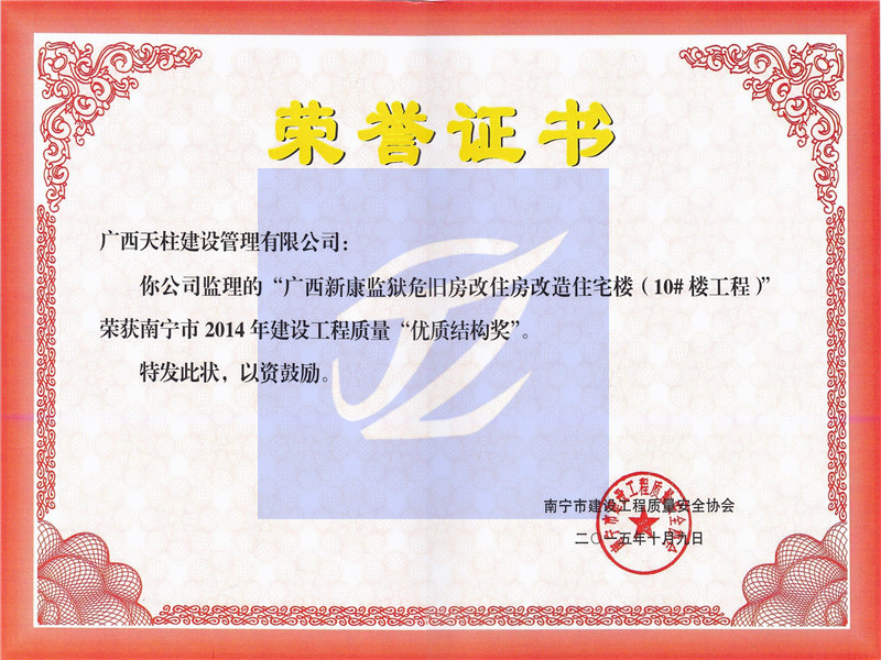 广西新康监狱职工集资楼(10#楼工程)2014年优质结构奖