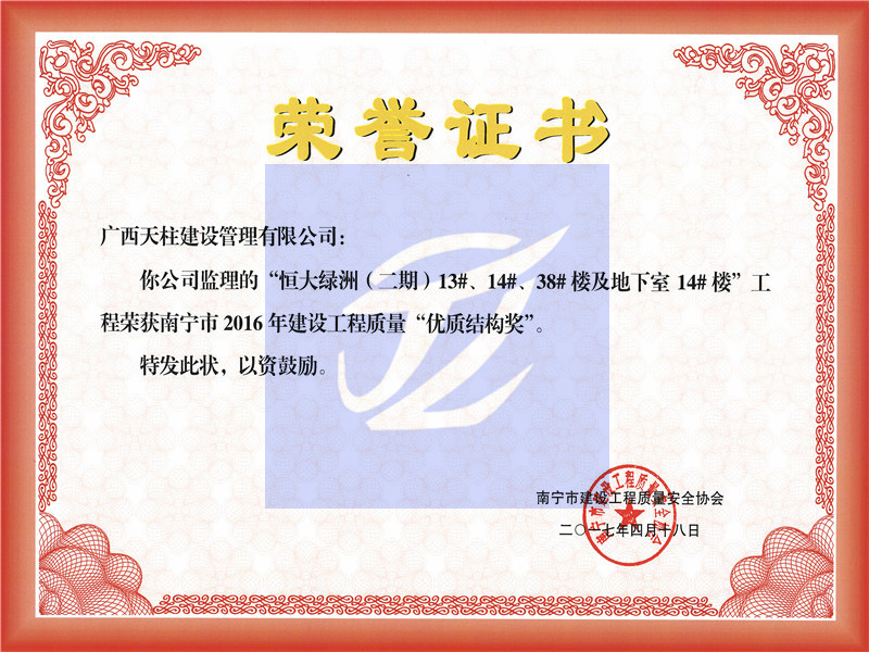 2016年南宁市优质结构奖恒大绿洲(二期)13#、14#、38#楼及地下室38#楼