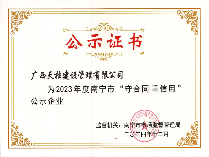近日,广西天柱建设管理有限公司接连荣获广西壮族自治区市场监督管理局和南宁市市场监督管理局颁发的2023年度“守合同 重信用”公示企业称号。这一双重荣誉的获得,不仅是对公司长期以来坚持诚信经营、严守契约精神的充分肯定,更是对公司综合实力和品牌信誉的高度认可。