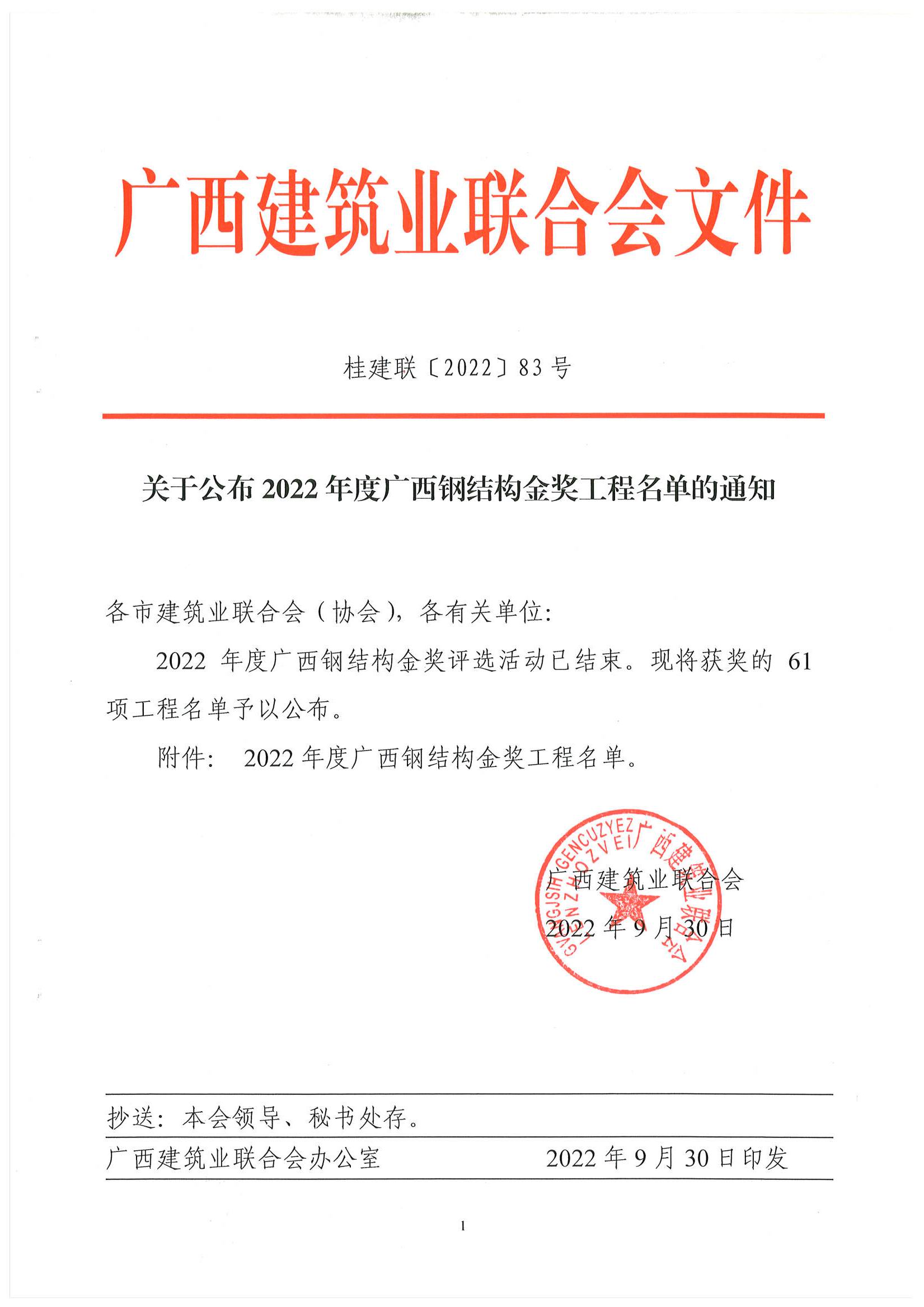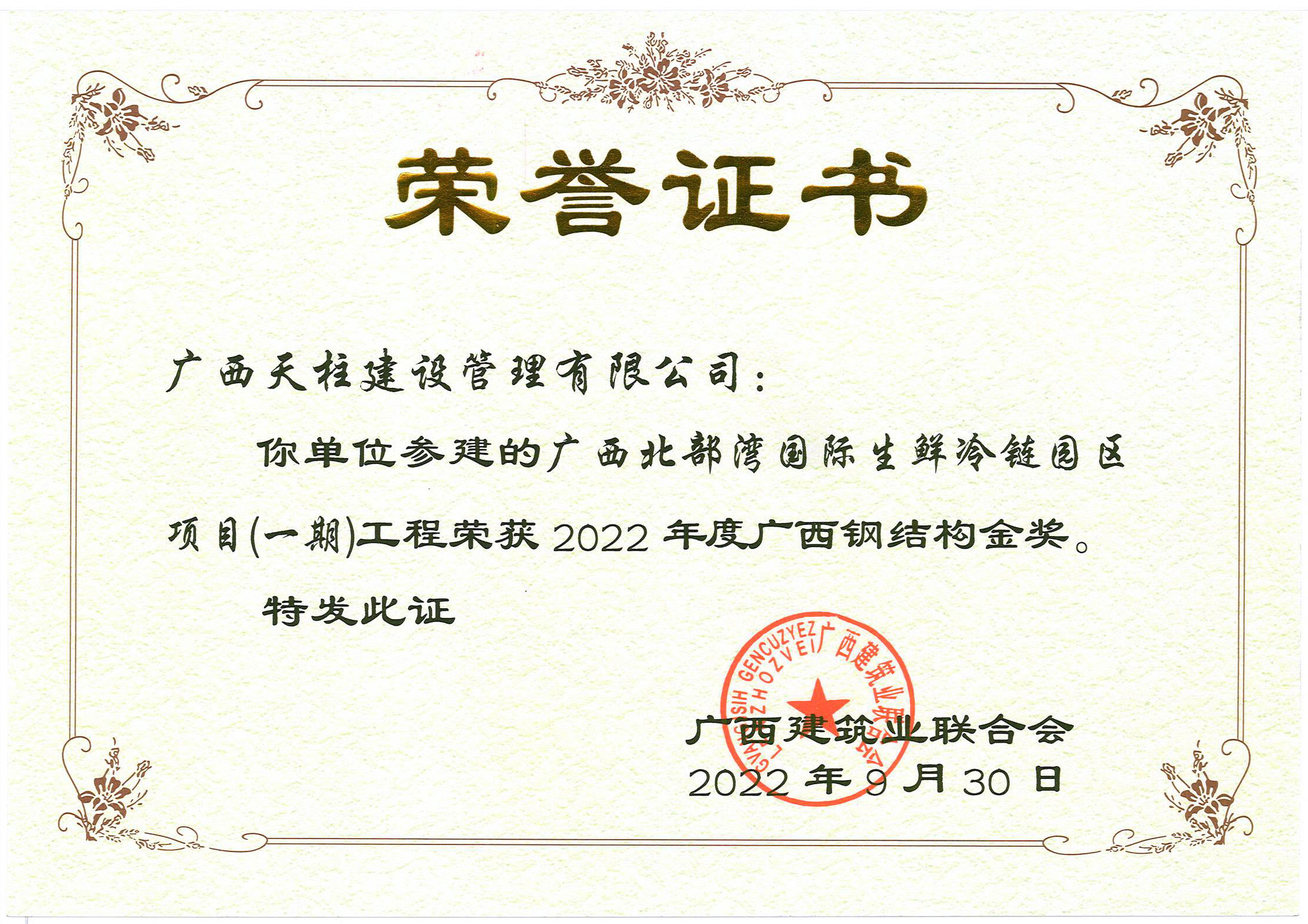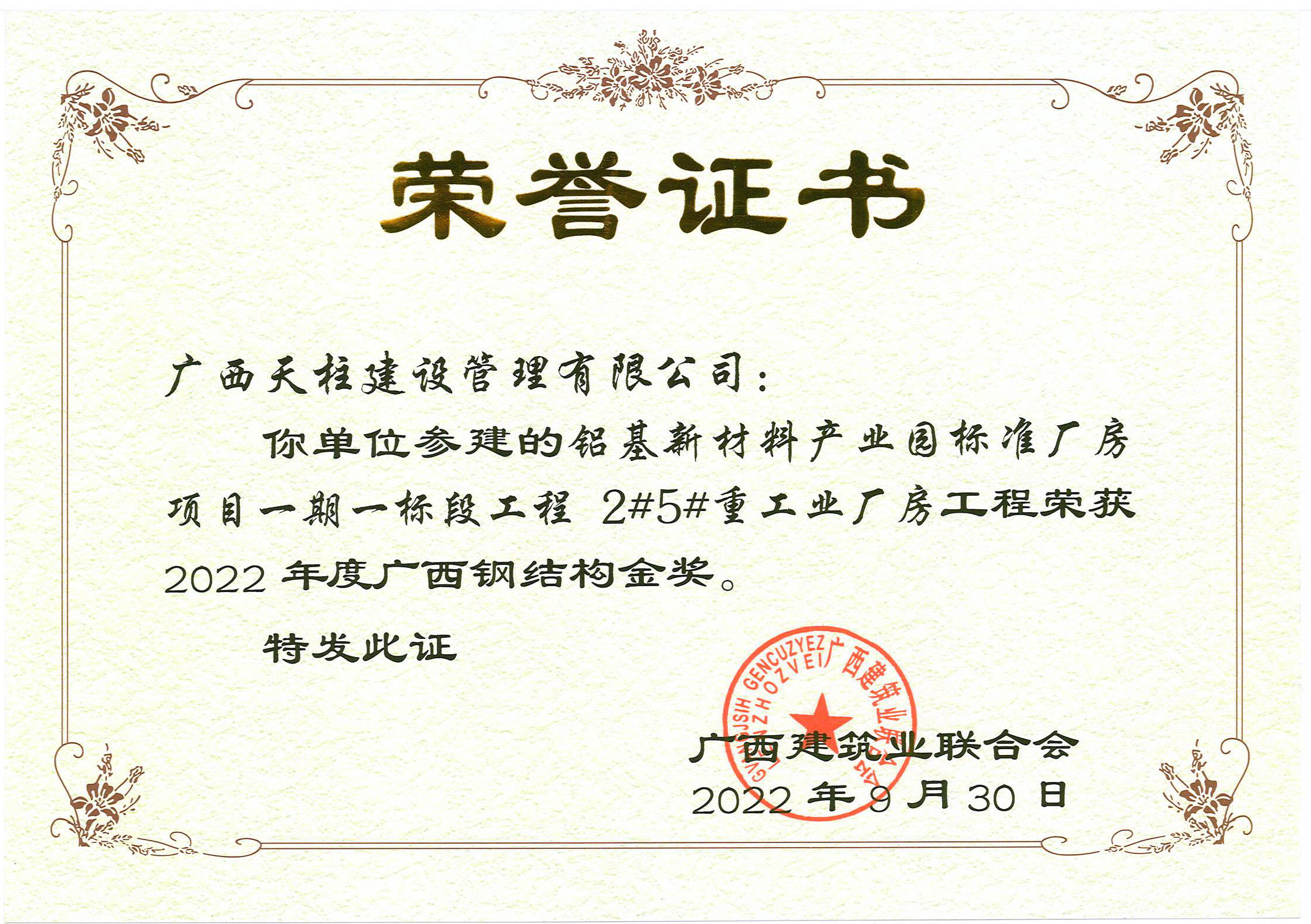 近日,广西建筑业联合会公布了2022年度广西钢结构金奖工程名单,广西天柱建设管理有限公司参建的广西北部湾国际生鲜冷链园区项目(一期)、铝基新材料产业园标准厂房项目一期一标段工程2#5#重工业厂房荣获2022年度广西钢结构金奖。