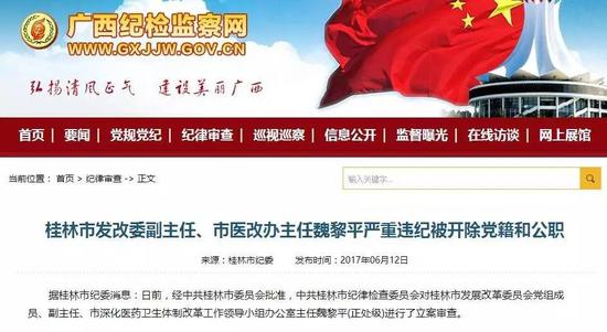 桂林市发改委副主任、市医改办主任魏黎平严重违纪被开除党籍和公职