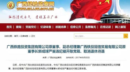 日前,经中共广西壮族自治区委员会批准,中共广西壮族自治区纪律检查委员会对广西铁路投资集团有限公司原董事、副总经理兼广西铁投冠信贸易有限公司原董事长郭成球严重违纪问题立案审查。