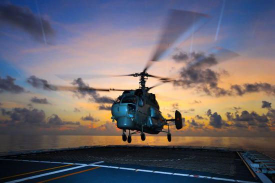 卡-28反潜直升机从054A首舰徐州舰上起飞。