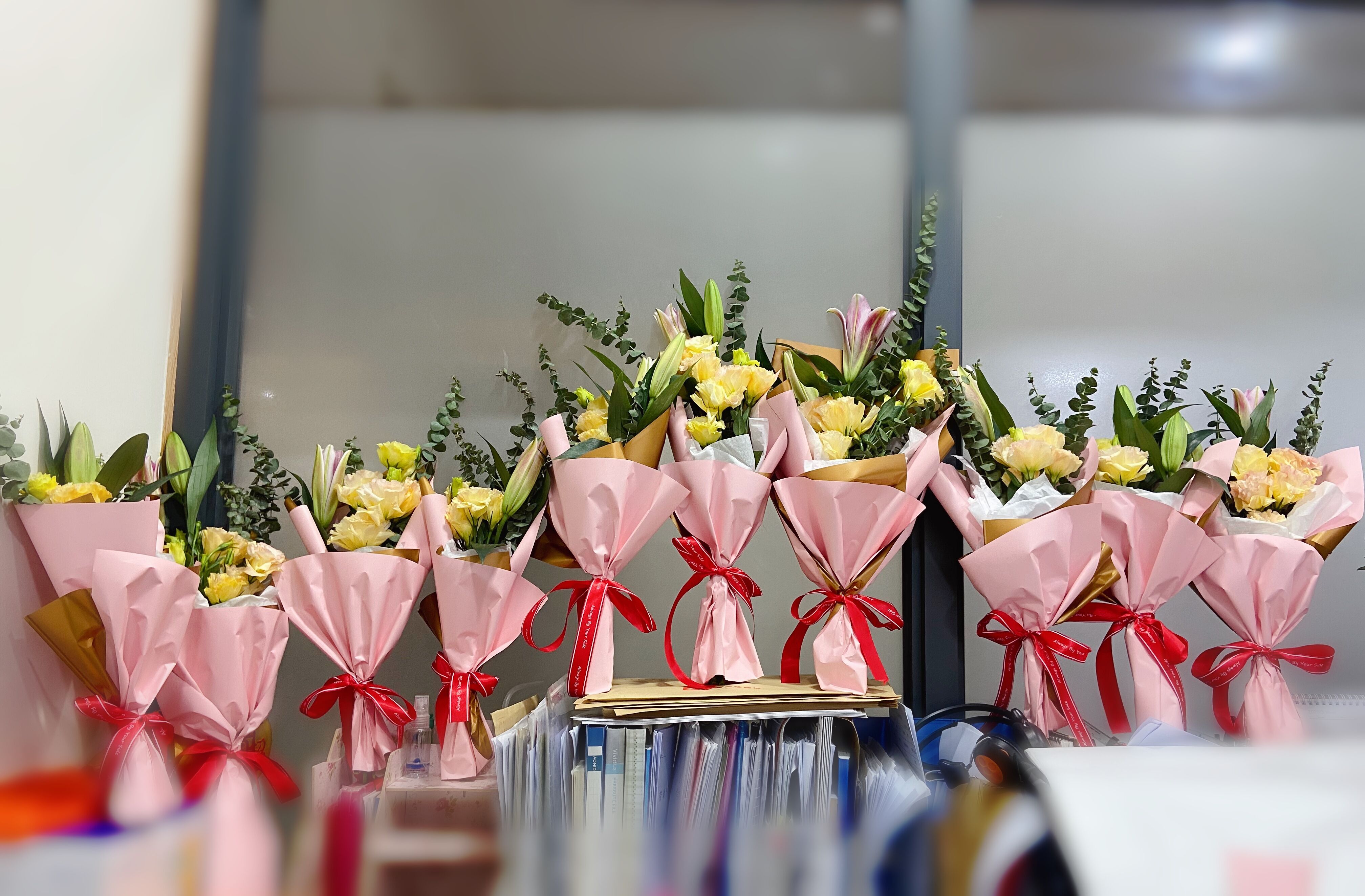 鲜花送佳人,温暖女人心!为了减少聚集,工会主席带领个别女职工,亲自制作花束,献给女职工。